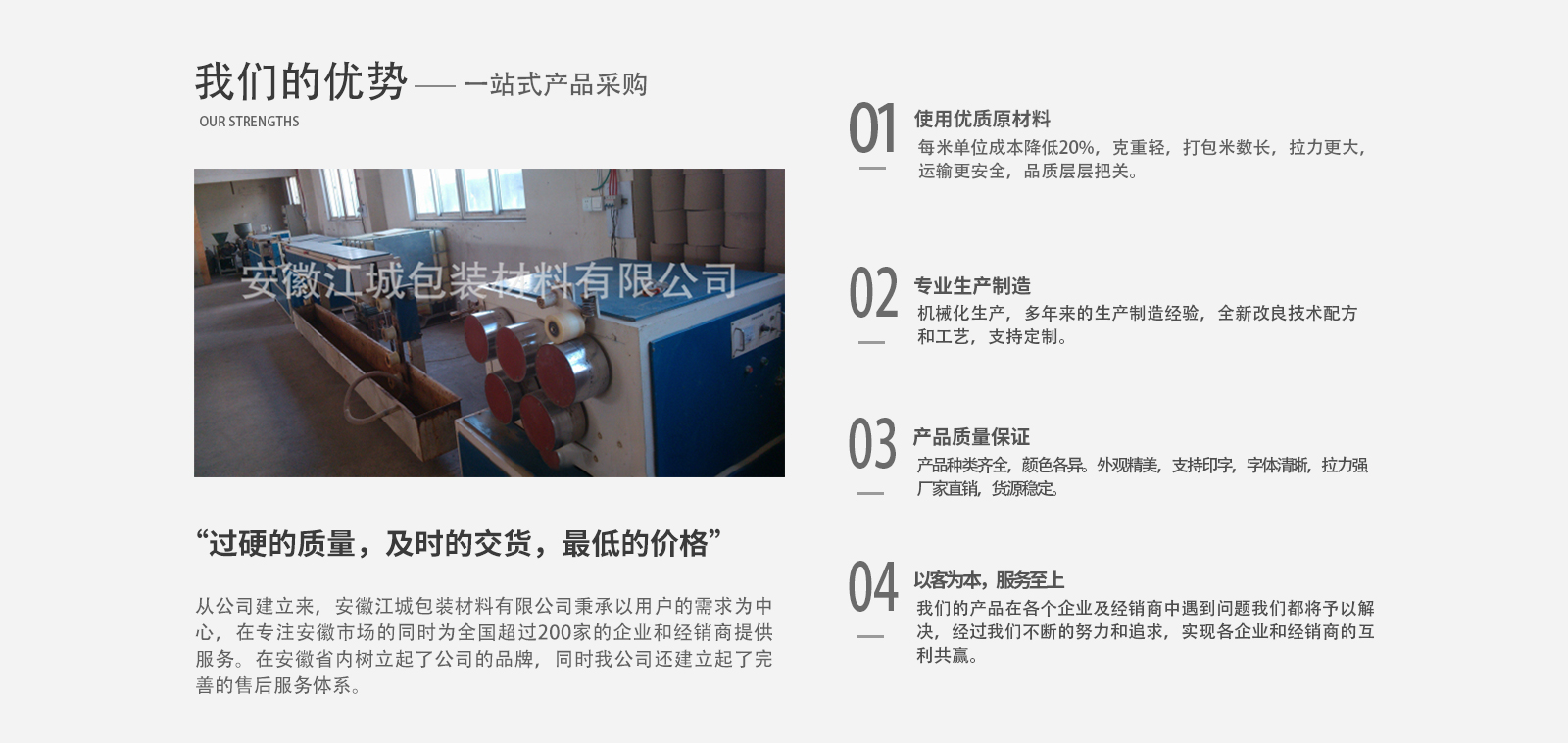 安徽江城包裝材料有限公司成立于2008年,注冊(cè)于2010年,公司總部設(shè)立在安徽蕪湖,是安徽省內(nèi)專業(yè)生產(chǎn)與銷售打包帶、透明膠帶的公司之一。公司主要效勞于大中小企業(yè),并大力開發(fā)省內(nèi)經(jīng)銷商。公司以“過硬的質(zhì)量,及時(shí)的交貨,低的價(jià)格”,為企業(yè)的立身之本。希望用我們的不懈努力,帶給我們客戶大的效益。從公司建立來(lái),安徽江城包裝材料有限公司秉承以用戶的需求為中心,在專注安徽市場(chǎng)的同時(shí)為全國(guó)超過200家的企業(yè)和經(jīng)銷商提供服務(wù),“過硬的質(zhì)量,及時(shí)的交貨,低的價(jià)格”博得了縱多的企業(yè)和經(jīng)銷商的好評(píng),在安徽省內(nèi)逐步樹立起了公司的品牌,同時(shí)我公司還建立起了完善的售后服務(wù)體系。為我們的產(chǎn)品在各個(gè)企業(yè)及經(jīng)銷商中遇到的問題予以解決,經(jīng)過我們不斷的努力和追求,實(shí)現(xiàn)各企業(yè)和經(jīng)銷商的互利共贏。